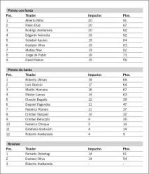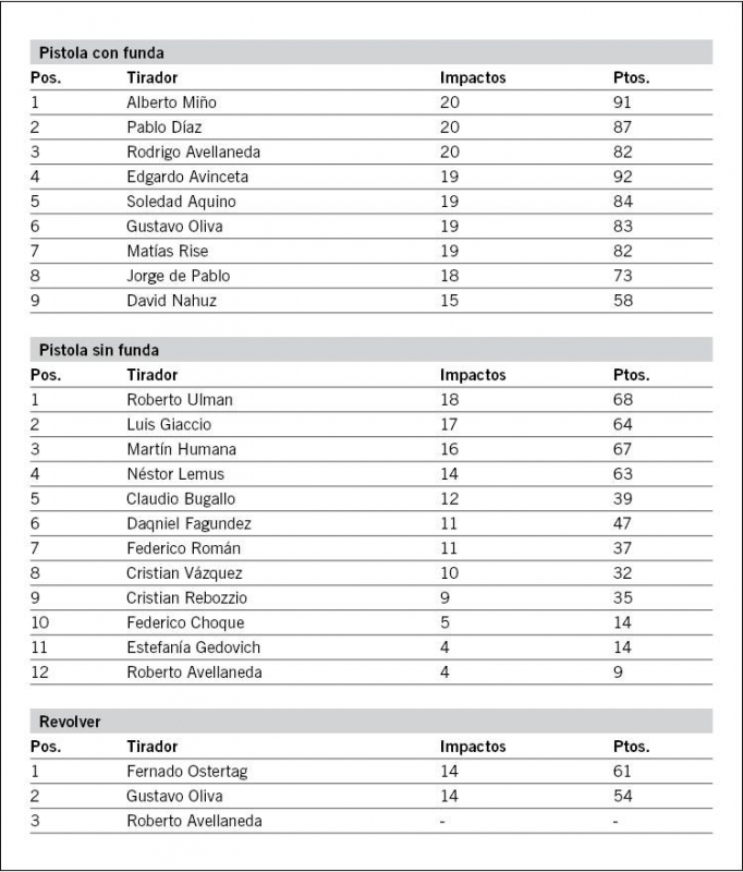 En la categoría sin funda, Roberto Ulman supo imponerse con 18 impactos. Luis Giaccio con 17 y Martín Humana con 16 lo escoltaron en el podio. En tanto que en revolver Fernando Ostertag y Gustavo Oliva Gerli empataban en impactos, 14, pero el primero de estos lograba mejor sumatoria obteniendo 61 puntos sobre 54 de Gerli y por consecuencia ganaba el segmento.