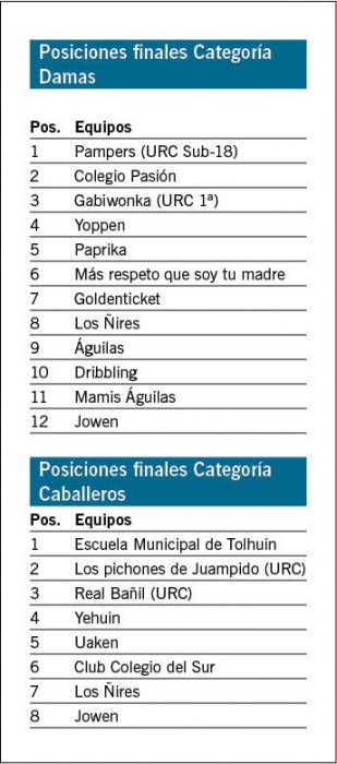 Por su parte en caballeros se hicieron dos zonas de cuatro equipos, la “A” la integraron Los Pichones de Juampi, Los Ñires, Uaken, Yehuin. y la “B” con Real Bañil, Tolhuin, Jowen, Club Colegio del Sur.