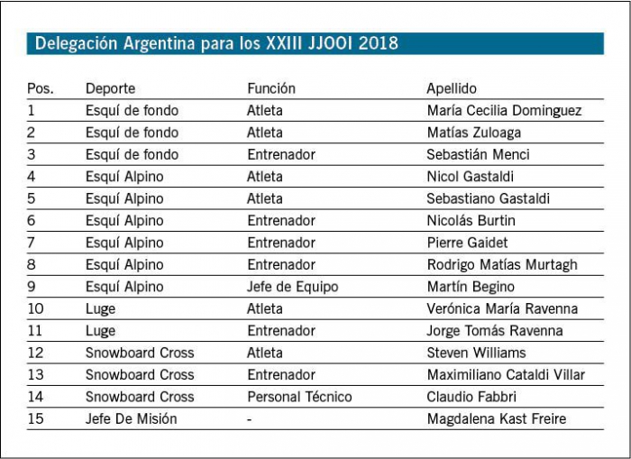 inalmente el Comité Olímpico Argentino dio a conocer el listado oficial de los atletas y entrena dores que vestirán la albiceleste en PyeongChang, Corea del Sur, en los XXIII Juegos Olímpicos de Invierno que se realizarán del 9 al 25 de febrero.