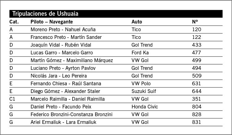 La categoría “F” para autos a carburador hasta 2000 c.c. preparación libre, cuenta sólo con 3 binomios en total y sin ushuaienses en el listado.