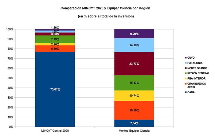 En comparación, en el año 2020, la inversión se ubicaba mayoritariamente en la Ciudad Autónoma de Buenos Aires, donde históricamente el 85% del gasto de ciencia y tecnología se concentraba en la zona metropolitana. El restante lo completaban las otras regiones, las cuales no alcanzaban el 10%.
