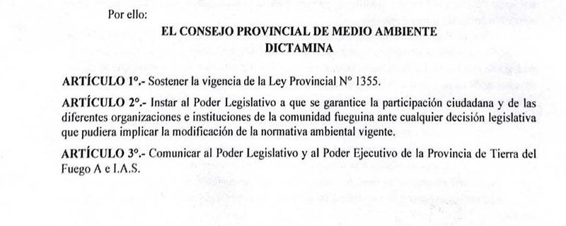 on duros cuestionamientos al contenido de la propuesta como al trámite seguido para su evaluación, el Consejo Provincial de Medio Ambiente se pronunció en contra del proyecto del Poder Ejecutivo que impulsa la derogación de la ley 1355 y la aprobación de un marco normativo integral que regula la acuicultura, ya que afirma que plantea “una modificación total de la normativa ambiental vigente”.